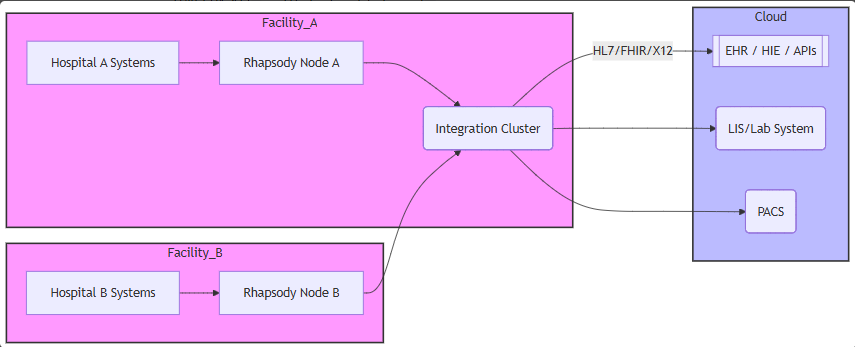 This simplified flowchart shows two facilities – A and B, each running a local integration engine node (e.g., Rhapsody). Both nodes feed into a central integration cluster (on-prem or cloud). The central cluster handles routing to various targets (EHRs, labs, imaging, APIs), illustrating horizontal scaling across facilities.